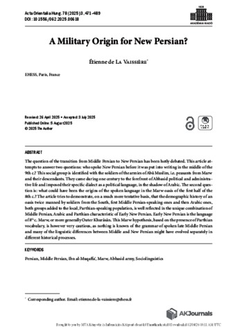 La Vaissière, Étienne de (2025) A Military Origin for New Persian? ACTA ORIENTALIA ACADEMIAE SCIENTIARUM HUNGARICAE, 78 (3). pp. 471-489. ISSN 0001-6446