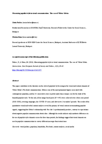 Farkas, Xénia and Bene, Márton (2026) Measuring populist style in visual communication: The case of Viktor Orbán. INTERSECTIONS: EAST EUROPEAN JOURNAL OF SOCIETY AND POLITICS, 11 (3). pp. 39-65. ISSN 2416-089X