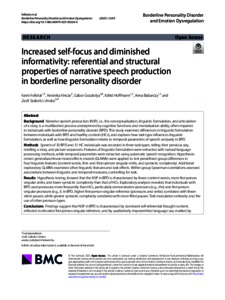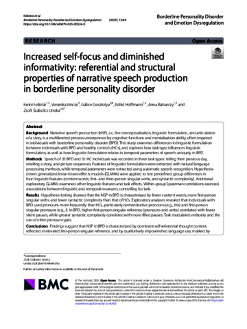 Felletár, Fanni and Vincze, Veronika and Gosztolya, Gábor and Hoffmann, Ildikó and Babarczy, Anna and Unoka, Zsolt (2025) Increased self-focus and diminished informativity: referential and structural properties of narrative speech production in borderline personality disorder. BORDERLINE PERSONALITY DISORDER AND EMOTION DYSREGULATION, 12 (1). No. 49. ISSN 2051-6673