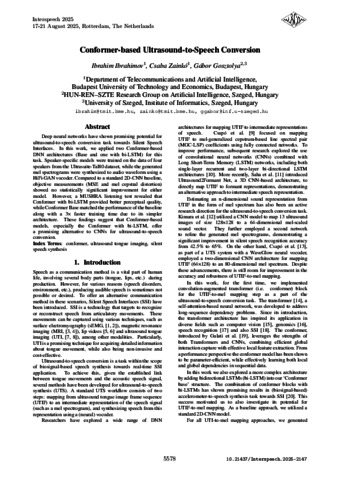 Ibrahimov, Ibrahim and Zainkó, Csaba and Gosztolya, Gábor (2025) Conformer-based Ultrasound-to-Speech Conversion. In: Annual Conference of the International Speech Communication Association, INTERSPEECH 2025. Interspeech . International Speech Communication Association (ISCA), Dublin, pp. 5578-5582.