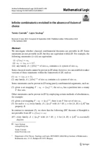 We investigate whether classical combinatorial theorems are provable in ZF. Some statements are not provable in ZF, but they are equivalent within ZF. For example, the following statements (i)–(iii) are equivalent: cf({\omega }_1)={\omega }_1 c f ( ω 1 ) = ω 1 , {\omega }_1\rightarrow ({\omega }_1,{\omega }+1)^2 ω 1 → ( ω 1 , ω + 1 ) 2 , any family \mathcal {A}\subset [{On}]^{<{\omega }} A ⊂ [ On ] < ω of size {\omega }_1 ω 1 contains a \Delta Δ -system of size {\omega }_1 ω 1 . Some classical results cannot be proven in ZF alone; however, we can establish weaker versions of these statements within the framework of ZF, such as {{\omega }_2}\rightarrow ({\omega }_1,{\omega }+1) ω 2 → ( ω 1 , ω + 1 ) , any family \mathcal {A}\subset [{On}]^{<{\omega }} A ⊂ [ On ] < ω of size {\omega }_2 ω 2 contains a \Delta Δ -system of size {\omega }_1 ω 1 . Some statements can be proven in ZF using purely combinatorial arguments, such as: given a set mapping F:{\omega }_1\rightarrow {[{\omega }_1]}^{<{\omega }} F : ω 1 → [ ω 1 ] < ω , the set {\omega }_1 ω 1 has a partition into {\omega } ω -many F -free sets. Other statements can be proven in ZF by employing certain methods of absoluteness, for example: given a set mapping F:{\omega }_1\rightarrow {[{\omega }_1]}^{<{\omega }} F : ω 1 → [ ω 1 ] < ω , there is an F -free set of size {\omega }_1 ω 1 , for each n\in {\omega } n ∈ ω , every family \mathcal {A}\subset {[{\omega }_1]}^{{\omega }} A ⊂ [ ω 1 ] ω with |A\cap B|\le n | A ∩ B | ≤ n for \{A,B\}\in {[\mathcal {A}]}^{2} { A , B } ∈ [ A ] 2 has property B . In contrast to statement (5), we show that the following ZFC theorem of Komjáth is not provable from ZF + cf({\omega }_1)={\omega }_1 c f ( ω 1 ) = ω 1 : (6 ^* ∗ ) every family \mathcal {A}\subset {[{\omega }_1]}^{{\omega }} A ⊂ [ ω 1 ] ω with |A\cap B|\le 1 | A ∩ B | ≤ 1 for \{A,B\}\in {[\mathcal {A}]}^{2} { A , B } ∈ [ A ] 2 is essentially disjoint .