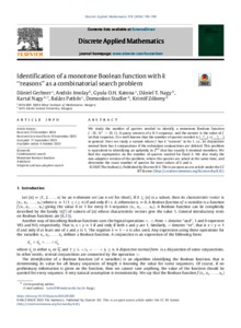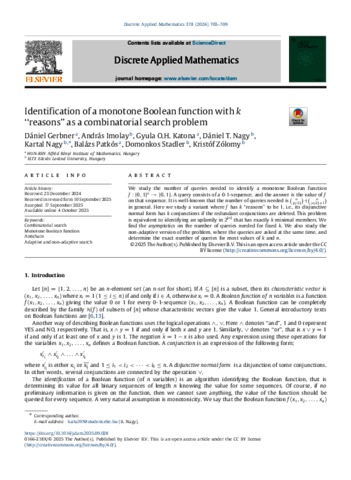 Gerbner, Dániel and Imolay, András and Katona, Gyula and Nagy, Dániel and Nagy, Kartal and Patkós, Balázs and Stadler, Domonkos and Zólomy, Kristóf (2026) Identification of a monotone Boolean function with k “reasons” as a combinatorial search problem. DISCRETE APPLIED MATHEMATICS, 378. pp. 703-709. ISSN 0166-218X