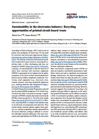 Gere, Dániel and Bárány, Tamás (2025) Sustainability in the electronics industry: Recycling opportunities of printed circuit board waste. EXPRESS POLYMER LETTERS, 19 (6). pp. 554-555. ISSN 1788-618X