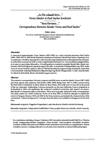 Dalos, Anna (2026) "Az Ön odaadó híve..." Veress Sándor és Paul Sacher levelezése = “Your Devotee…” Correspondence Between Sándor Veress and Paul Sacher. MAGYAR TUDOMÁNY, 187 (2). pp. 212-220. ISSN 0025-0325