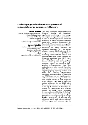 Molnár, László and Horváth, Ágnes (2025) Exploring regional and settlement patterns of residential energy awareness in Hungary. Regional Statistic : journal of the Hungarian Central Statistical Office, 15 (4). pp. 627-652. ISSN 2063-9538