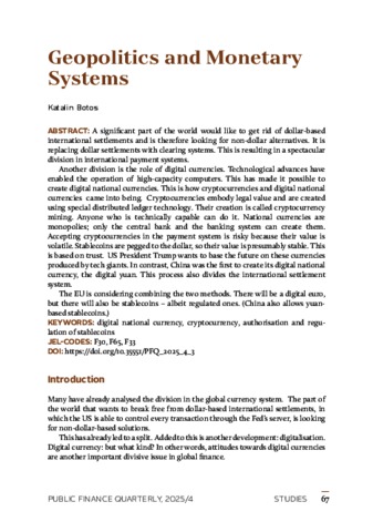 Botos, Katalin (2025) Geopolitics and Monetary Systems. PÉNZÜGYI SZEMLE/PUBLIC FINANCE QUARTERLY (1963-), 71 (4). pp. 67-78. ISSN 0031-496X
