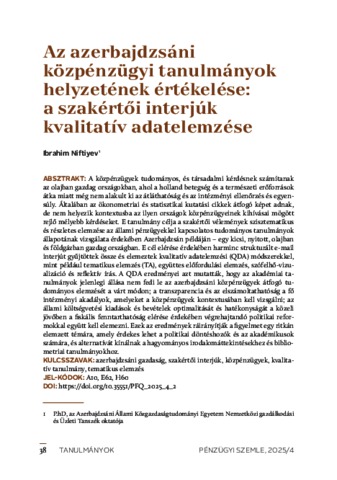 A közpénzügyek tudományos, és társadalmi kérdésnek számítanak az olajban gazdag országokban, ahol a holland betegség és a természeti erőforrások átka miatt még nem alakult ki az átláthatóság és az intézményi ellenőrzés és egyensúly. Általában az ökonometriai és statisztikai kutatási cikkek átfogó képet adnak, de nem helyezik kontextusba az ilyen országok közpénzügyeinek kihívásai mögött rejlő mélyebb kérdéseket. E tanulmány célja a szakértői vélemények szisztematikus és részletes elemzése az állami pénzügyekkel kapcsolatos tudományos tanulmányok állapotának vizsgálata érdekében Azerbajdzsán példáján – egy kicsi, nyitott, olajban és földgázban gazdag országban. E cél elérése érdekében harminc strukturált e-mail interjút gyűjtöttek össze és elemeztek kvalitatív adatelemzési (QDA) módszerekkel, mint például tematikus elemzés (TA), együttes előfordulási elemzés, szófelhő-vizualizáció és reflektív írás. A QDA eredményei azt mutatták, hogy az akadémiai tanulmányok jelenlegi állása nem fedi le az azerbajdzsáni közpénzügyek átfogó tudományos elemzését a várt módon; a transzparencia és az elszámoltathatóság a fő intézményi akadályok, amelyeket a közpénzügyek kontextusában kell vizsgálni; az állami költségvetési kiadások és bevételek optimalitását és hatékonyságát a közeli jövőben a fiskális fenntarthatóság elérése érdekében végrehajtandó politikai reformokkal együtt kell elemezni. Ezek az eredmények ráirányítják a figyelmet egy ritkán elemzett témára, amely érdekes lehet a politikai döntéshozók és az akadémikusok számára, és alternatívát kínálnak a hagyományos irodalomáttekintésekhez és bibliometriai tanulmányokhoz. | Public finance is both an academic and a social issue when it comes to oil-rich countries where transparency and institutional checks and balances are yet established due to the Dutch disease and the curse of natural resources. Typically, some econometric and statistical research papers show the big picture but fail to contextualize the deeper issues behind the challenges of public finance in such countries. The aim of this study is to conduct a systematic and detailed analysis of expert opinions to examine the state of academic studies on public finance using the example of Azerbaijan—a small, open economy rich in oil and natural gas. To achieve this goal, thirty structured email interviews were collected and analyzed using qualitative data analysis (QDA) methods such as thematic analysis (TA), cooccurrence analysis, word cloud visualization and reflective writing. The QDA results revealed that the current state of academic studies does not cover the comprehensive scientific analysis of public finance in Azerbaijan in the expected way; transparency and accountability are the main institutional barriers that need to be studied in the context of public finance; the optimality and efficiency of state budget expenditures and revenues need to be analyzed along with policy reforms to achieve fiscal sustainability in the near future. These findings shed a unique light on a rarely analyzed topic that may be of interest to policy makers and academics, providing an alternative to the traditional literature reviews and bibliometric studies in this direction.