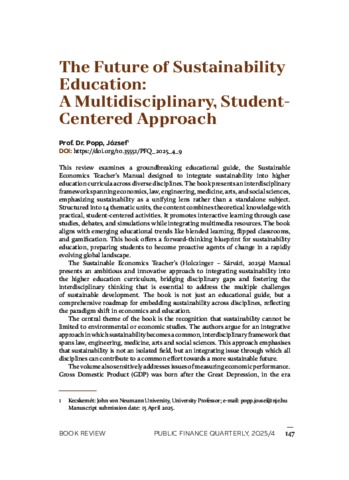 This review examines a groundbreaking educational guide, the Sustainable Economics Teacher’s Manual designed to integrate sustainability into higher education curricula across diverse disciplines. The book presents an interdisciplinary framework spanning economics, law, engineering, medicine, arts, and social sciences, emphasizing sustainability as a unifying lens rather than a standalone subject. Structured into 14 thematic units, the content combines theoretical knowledge with practical, student-centered activities. It promotes interactive learning through case studies, debates, and simulations while integrating multimedia resources. The book aligns with emerging educational trends like blended learning, flipped classrooms, and gamification. This book offers a forward-thinking blueprint for sustainability education, preparing students to become proactive agents of change in a rapidly evolving global landscape. | A Fenntartható közgazdaságtan című oktatói kézikönyv célja a fenntarthatóság integrálása a felsőoktatási tantervekbe különböző tudományágakban. A könyv interdiszciplináris kerete átfogja a közgazdaságtant, a jogot, a mérnöki tudományokat, az orvostudományt, a művészeteket és a társadalomtudományokat: a fenntarthatóságot egyesítő platformként, és nem különálló tantárgyként mutatja be. A 14 tematikus egységre tagolt mű az elméleti ismereteket gyakorlati, hallgatóközpontú tevékenységekkel ötvözi. Esettanulmányok, viták és szimulációk révén elősegíti az interaktív tanulást, miközben multimédiás forrásokat is integrál. A könyv kapcsolódik az újonnan megjelenő oktatási trendekhez, mint a tantermi és e-learning módszer vegyes alkalmazása (blended learning), a tükrözött osztályterem és a játékosítás. Ez a könyv előremutató gyakorlati ismereteket kínál a fenntarthatóság oktatásához, felkészítve a hallgatókat arra, hogy a gyorsan változó globális környezetben a változás proaktív szereplőivé váljanak.