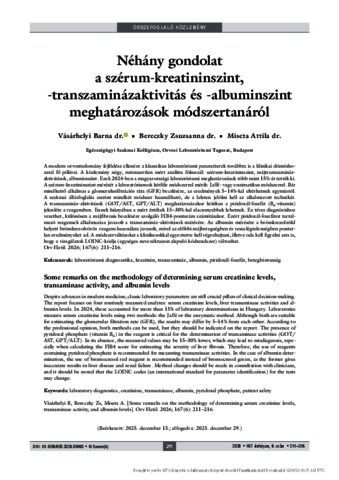Vásárhelyi, Barna and Bereczky, Zsuzsanna and Miseta, Attila (2026) Néhány gondolat a szérum-kreatininszint, -transzaminázaktivitás és -albuminszint meghatározások módszertanáról = Some remarks on the methodology of determining serum creatinine levels, transaminase activity, and albumin levels. ORVOSI HETILAP, 167 (6). pp. 211-216. ISSN 0030-6002