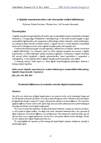 A digitális transzformáció egyik legkritikusabb kérdése, hogy a munkavállalók mennyire készültek fel a technológiai változásokra, és ez hogyan függ a lakóhelyüktől. Tanulmányunk egy 117 fős mintán keresztül vizsgálja a magyar munkavállalók digitalizációhoz való viszonyulását és felkészültségét, különös tekintettel a területi különbségekre. Az eredmények jelentős eltéréseket mutatnak a főváros, a nagyobb városok és a kisebb települések munkavállalói között mind a technológiai ismeretek, mind a digitális transzformációhoz való hozzáállás terén. A kutatás három hipotézist vizsgált: az iskolai végzettség, a vállalati méret és a lakóhely, valamint a nem hatását a digitális felkészültségre. Az eredmények szerint az iskolai végzettség önmagában nem garancia a digitális kompetenciákra, a területi különbségek azonban markánsan megjelennek. A fővárosban és nagyobb városokban élők nemcsak jobban hozzáférnek a digitális infrastruktúrához, hanem pozitívabban is viszonyulnak a technológiákhoz. A nők szkeptikusabbak a digitális transzformációval kapcsolatban, mint a férfiak.A tanulmány rámutat a duális képzés és a célzott digitális kompetenciafejlesztés fontosságára, különösen a hátrányos helyzetű régiókban. | One of the most critical issues of digital transformation is how prepared workers are for technological changes and how this depends on their place of residence. Our study examines Hungarian workers' attitudes towards and readiness for digitalization through a sample of 117 people, with particular attention to territorial differences. The results show significant differences between workers in the capital, larger cities and smaller settlements in terms of both technological knowledge and attitudes towards digital transformation. The research examined three hypotheses: the effect of educational attainment, company size and place of residence, as well as gender on digital readiness. According to the results, educational attainment alone is not a guarantee of digital competencies, but territorial differences are markedly present. Those living in the capital and larger cities not only have better access to digital infrastructure, but also have a more positive attitude towards technologies. Women are more skeptical about digital transformation than men. The study highlights the importance of dual training and targeted digital competence development, especially in disadvantaged regions.