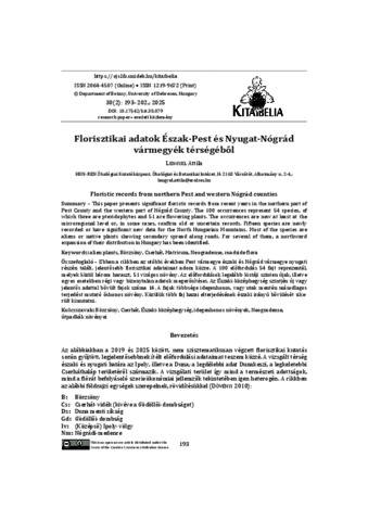 Lengyel, Attila (2025) Florisztikai adatok Észak-Pest és Nyugat-Nógrád vármegyék térségéből. KITAIBELIA, 30 (2). pp. 193-202. ISSN 1219-9672
