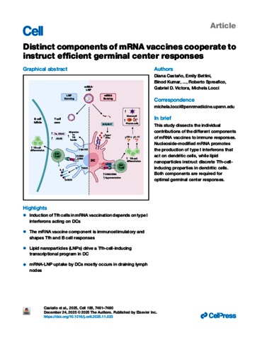 Castadno, Diana and Bettini, Emily and Kumar, Binod and Chudnovskiy, Aleksey and Siv, Anna and Protti, Giulia and Nakadakari-Higa, Sandra and Ceglia, Simona and De, Luna Nina and Chiu, Joy E. and Lederer, Katlyn and Li, Shuk Hang and Ibrahim, Hassaan and Muramatsu, Hiromi and Mdluli, Thandiswa and Ábrahám, Edit and Sahingur, Sinem E. and Maillard, Ivan and Tam, Ying K. and Shin, Sunny and Hensley, Scott E. and Miner, Jonathan J. and Lipinszki, Zoltán and Reboldi, Andrea and Pardi, Norbert and Spreafico, Roberto and Victora, Gabriel D. and Locci, Michela (2025) Distinct components of mRNA vaccines cooperate to instruct efficient germinal center responses. CELL, 188 (26). pp. 7461-7480. ISSN 0092-8674