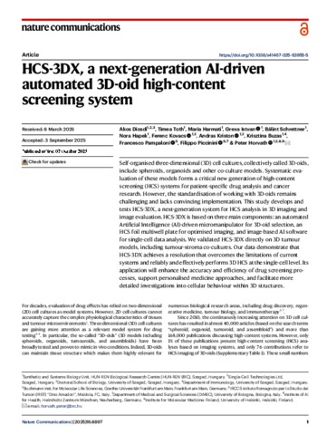 Diósdi, Ákos and Tóth, Tímea and Harmati, Mária and Grexa, István and Schrettner, Bálint and Hapek, Nóra and Kovács, Ferenc and Kriston, András and Buzás, Krisztina and Pampaloni, Francesco and Piccinini, Filippo and Horváth, Péter (2025) HCS-3DX, a next-generation AI-driven automated 3D-oid high-content screening system. NATURE COMMUNICATIONS, 16 (1). No. -8897. ISSN 2041-1723