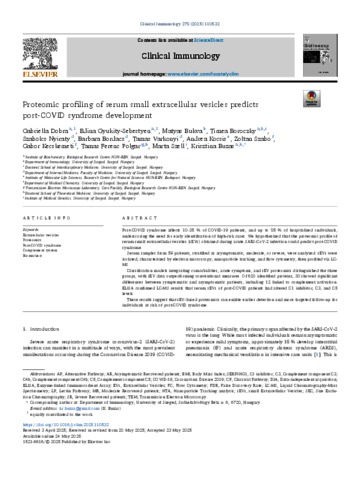 Dobra, Gabriella and Gyukity-Sebestyén, Edina and Bukva, Mátyás and Böröczky, Timea and Nyiraty, Szabolcs and Bordács, Barbara Anikó and Várkonyi, Tamás and Kocsis, Andrea and Szabó, Zoltán and Kecskeméti, Gábor and Polgár, Tamás Ferenc and Széll, Márta and Buzás, Krisztina (2025) Proteomic profiling of serum small extracellular vesicles predicts post-COVID syndrome development. CLINICAL IMMUNOLOGY, 278. No. -110532. ISSN 1521-6616