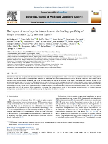 Egyed, Attila and Kiss, Dóra Judit and Pável, Zsófia and Rajna, Keve and Gaitonde, Supriya A. and Dubiel, Mariam and Loza, María Isabel and Szűcs, Edina and Borbély, Éva and Hajna, Zsófia Réka and Satala, Grzegorz and Vass, Márton and Szabó, Pál Tamás and Jósvay, Katalin and Bojarski, Andrzej J. and Stark, Holger and Helyes, Zsuzsanna and Pintér, Erika and Bouvier, Michel and Keserű, György Miklós (2025) The impact of secondary site interactions on the binding specificity of bitopic dopamine D2/D3 receptor ligands. EUROPEAN JOURNAL OF MEDICINAL CHEMISTRY REPORTS, 15. No. 100302. ISSN 2772-4174