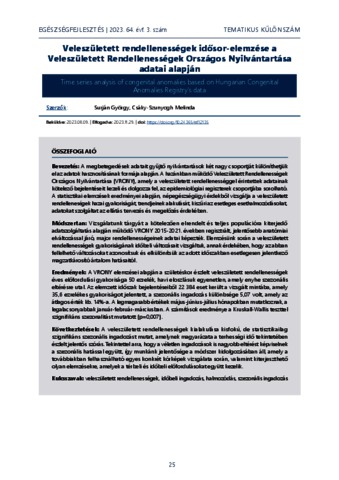 Surján, György and Csáky-Szunyogh, Melinda (2023) Veleszületett rendellenességek idősor-elemzése a Veleszületett Rendellenességek Országos Nyilvántartása adatai alapján = Time series analysis of congenital anomalies based on Hungarian Congenital Anomalies Registry’s data. EGÉSZSÉGFEJLESZTÉS, 64 (3). pp. 25-31. ISSN 1786-2434 (nyomtatott); 2498-6666 (elektronikus)