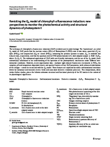 Garab, Győző (2025) Revisiting the QA model of chlorophyll-a fluorescence induction: new perspectives to monitor the photochemical activity and structural dynamics of photosystem II. PHOTOSYNTHESIS RESEARCH, 163 (6). No. -54. ISSN 0166-8595