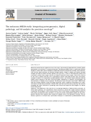 Guedes, J. and Szadai, Leticia and Woldmar, N. and Jánosi, Ágnes Judit and Koroncziová, K. and Lengyel, B.M. and Kelemen, Bella and Baltás, Eszter and Gyulai, Rolland Péter and Wieslander, E. and Pawłowski, K. and Horvatovich, P. and Betancourt, L. and Szász, Attila Marcell and Veréb, Zoltán and Horváth, Péter and Oskolás, H. and Appelqvist, R. and Malm, J. and Marko-Varga, G. and Németh, István Balázs and Gil, J. (2025) The melanoma MEGA-study: Integrating proteogenomics, digital pathology, and AI-analytics for precision oncology. JOURNAL OF PROTEOMICS, 319. No. -105482. ISSN 1874-3919