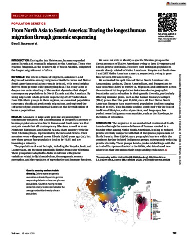 Gusareva, Elena S. and Ghosh, Amit Gourav and Kharkov, Vladimir N. and Khor, Seik-Soon and Zarubin, Aleksei and Moshkov, Nikita and Kalsi, Namrata and Ratan, Aakrosh and Heinle, Cassie E. and Cooke, Niall and Bravi, Claudio M. and Smolnikova, Marina V. and Tereshchenko, Sergey Yu. and Kasparov, Eduard W. and Khitrinskaya, Irina and Marusin, Andrey and Razhabov, Magomed O. and Golubenko, Maria V. and Swarovskaya, Maria and Kolesnikov, Nikita A. and Vagaitseva, Ksenia V. and Eremina, Elena R. and Sukhomyasova, Aitalina and Shtygasheva, Olga and Panicker, Deepa and Ang, Poh Nee and Lee, Choou Fook and Koh, Yanqing and Leong, See Ting and Park, Changsook (2025) From North Asia to South America: Tracing the longest human migration through genomic sequencing. SCIENCE, 388 (6748). ISSN 0036-8075