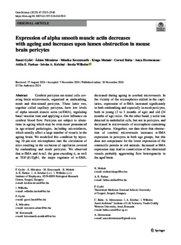 Győri, Fanni and Mészáros, Ádám and Krecsmarik, Mónika and Molnár, Kinga and Balta, Cornel and Hermenean, Anca and Farkas, Elek Attila and Krizbai, István Adorján and Wilhelm, Imola Mária (2025) Expression of alpha smooth muscle actin decreases with ageing and increases upon lumen obstruction in mouse brain pericytes. GEROSCIENCE: OFFICIAL JOURNAL OF THE AMERICAN AGING ASSOCIATION (AGE), 47 (2). pp. 2525-2540. ISSN 2509-2715