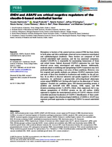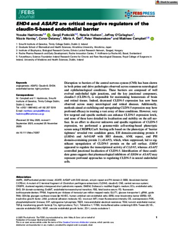 Hashimoto, Yosuke and Porkoláb, Gergő and Hudson, Natalie and O'Callaghan, Jeffrey and Hanley, Nicole and Delaney, Conor and Deli, Mária Anna and Westenskow, Peter and Campbell, Matthew (2025) EHD4 and ASAP2 are critical negative regulators of the claudin‐5‐based endothelial barrier. FEBS JOURNAL. ISSN 1742-464X