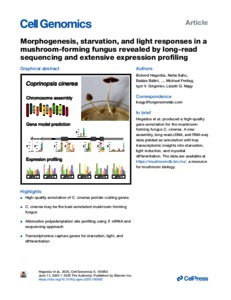 Hegedüs, Botond and Sahu, Neha and Bálint, Balázs and Haridas, Sajeet and Bense, Viktória and Merényi, Zsolt and Virágh, Máté and WU, HONGLI and Liu, Xiao-Bin and Riley, Robert and Lipzen, Anna and Koriabine, Maxim and Savage, Emily and Guo, Jie and Barry, Kerrie and Ng, Vivian and Urbán, Péter and Gyenesei, Attila and Freitag, Michael and Grigoriev, Igor V and Nagy, László (2025) Morphogenesis, starvation, and light responses in a mushroom-forming fungus revealed by long-read sequencing and extensive expression profiling. CELL GENOMICS, 5 (6). No. 100853. ISSN 2666-979X