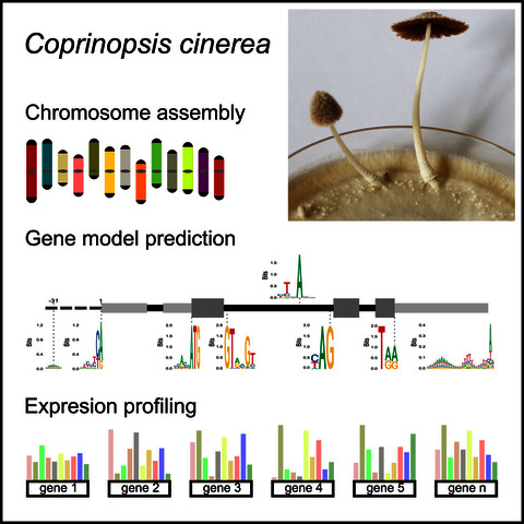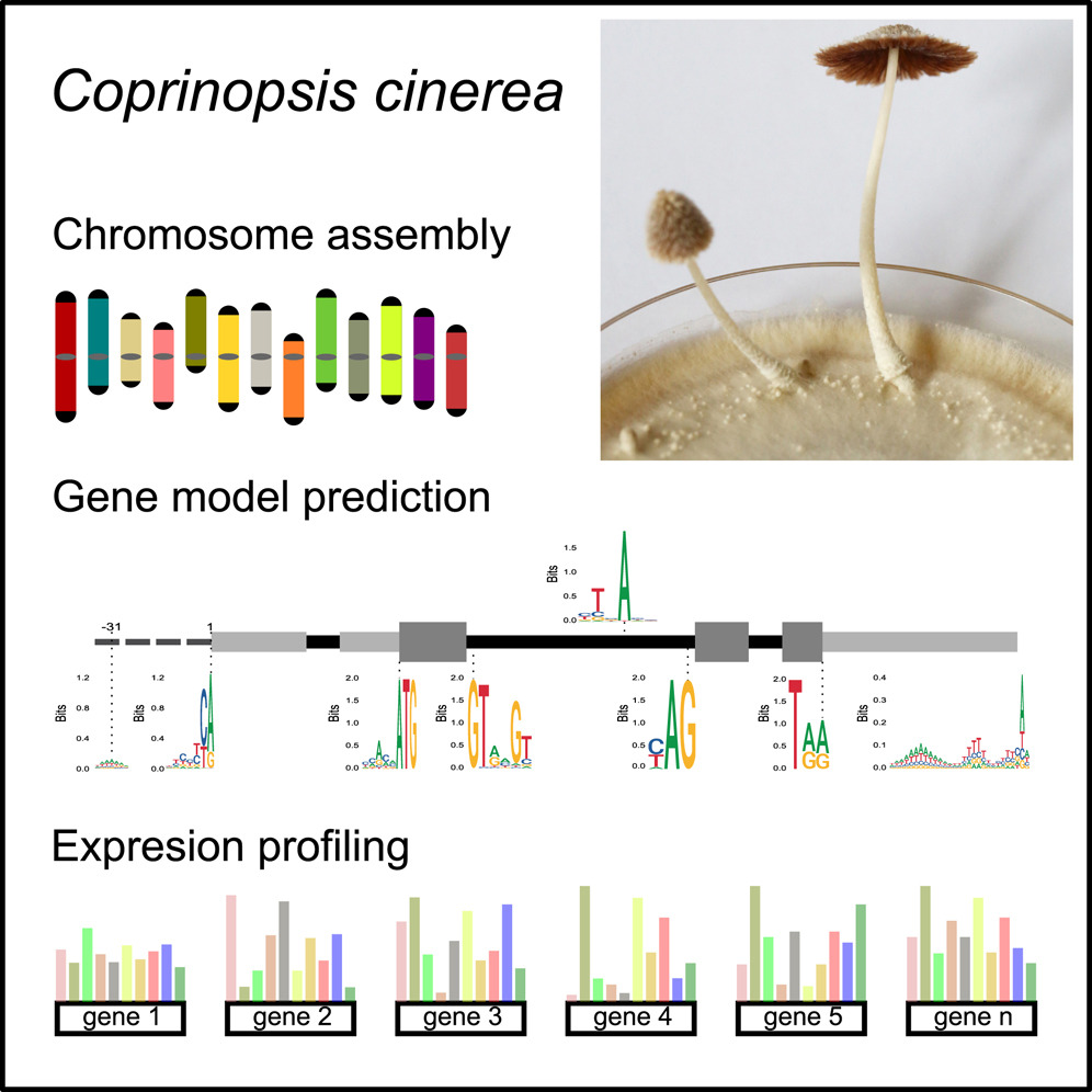 Mushroom-forming fungi (Agaricomycetes) are emerging as pivotal players in several fields of science and industry. Genomic data for Agaricomycetes are accumulating rapidly; however, this is not paralleled by improvements of gene annotations, which leave gene function notoriously poorly understood. We set out to improve our functional understanding of the model mushroom Coprinopsis cinerea by integrating a new, chromosome-level assembly, high-quality gene predictions, and functional information derived from broad gene-expression profiling data. The new annotation includes 5' and 3' untranslated regions (UTRs), polyadenylation sites (PASs), upstream open reading frames (uORFs), splicing isoforms, and microexons, as well as core gene sets corresponding to carbon starvation, light response, and hyphal differentiation. As a result, the genome of C. cinerea has now become the most comprehensively annotated genome among mushroom-forming fungi, which will contribute to multiple rapidly expanding fields, including research on their life history, light and stress responses, as well as multicellular development.
