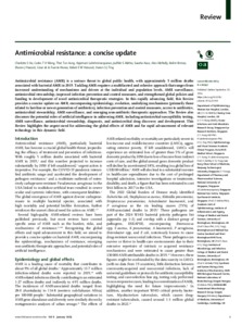 Antimicrobial resistance (AMR) is a serious threat to global public health, with approximately 5 million deaths associated with bacterial AMR in 2019. Tackling AMR requires a multifaceted and cohesive approach that ranges from increased understanding of mechanisms and drivers at the individual and population levels, AMR surveillance, antimicrobial stewardship, improved infection prevention and control measures, and strengthened global policies and funding to development of novel antimicrobial therapeutic strategies. In this rapidly advancing fi eld, this Review provides a concise update on AMR, encompassing epidemiology, evolution, underlying mechanisms (primarily those related to last-line or newer generation of antibiotics), infection prevention and control measures, access to antibiotics, antimicrobial stewardship, AMR surveillance, and emerging non-antibiotic therapeutic approaches. The Review also discusses the potential roles of artificial intelligence in addressing AMR, including antimicrobial susceptibility testing, AMR surveillance, antimicrobial stewardship, diagnosis, and antimicrobial drug discovery and development. This Review highlights the urgent need for addressing the global effects of AMR and for rapid advancement of relevant technology in this dynamic fi eld.