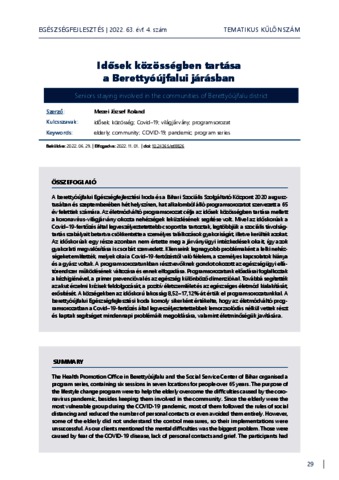 A berettyóújfalui Egészségfejlesztési Iroda és a Bihari Szociális Szolgáltató Központ 2020 augusztusában és szeptemberében hét helyszínen, hat alkalomból álló programsorozatot szervezett a 65 év felettiek számára. Az életmódváltó programsorozat célja az idősek közösségben tartása mellett a koronavírus-világjárvány okozta nehézségek leküzdésének segítése volt. Mivel az időskorúak a Covid–19-fertőzés által legveszélyeztetettebb csoportba tartoztak, legtöbbjük a szociális távolságtartás szabályait betartva csökkentette a személyes találkozások gyakoriságát, illetve kerülték azokat. Az időskorúak egy része azonban nem értette meg a járványügyi intézkedések okait, így azok gyakorlati megvalósítása is csorbát szenvedett. Klienseink legnagyobb problémaként a lelki nehézségeket említették, melyek okai a Covid–19-fertőzéstől való félelem, a személyes kapcsolatok hiánya és a gyász voltak. A programsorozatunkban résztvevőknek gondot okozott az egészségügyi ellátórendszer működésének változása és ennek elfogadása. Programsorozatunk előadásai foglalkoztak a kézhigiénével, a primer prevencióval és az egészség különböző dimenzióival. Továbbá segítették az akut érzelmi krízisek feldolgozását, a pozitív életszemlélet és az egészséges életmód kialakítását, erősítését. A községekben az időskorú lakosság 8,52–17,12%-át értük el programsorozatunkkal. A berettyóújfalui Egészségfejlesztési Iroda komoly sikerként értékelte, hogy az életmódváltó programsorozatban a Covid–19-fertőzés által legveszélyeztetettebbek lemorzsolódás nélkül vettek részt és kaptak segítséget mindennapi problémáik megoldására, valamint életminőségük javítására. | The Health Promotion Office in Berettyóújfalu and the Social Service Center of Bihar organised a program series, containing six sessions in seven locations for people over 65 years. The purpose of the lifestyle change program were to help the elderly overcome the difficulties caused by the coronavirus pandemic, besides keeping them involved in the community. Since the elderly were the most vulnerable group during the COVID-19 pandemic, most of them followed the rules of social distancing and reduced the number of personal contacts or even avoided them entirely. However, some of the elderly did not understand the control measures, so their implementations were unsuccessful. As our clients mentioned the mental difficulties was the biggest problem. Those were caused by fear of the COVID-19 disease, lack of personal contacts and grief. The participants had problems with the changed function of the health care system and to accept it. The main topics of our program were hand hygiene, primary prevention and different dimensions of health. Additional tasks included coping methods for acute emotional crisis, the establishment and strengthening of a healthy lifestyle and a positive outlook on life. We reached 8.52-17.12% of the elderly population in covered areas. Overall, the most significant result of the program was that there were no dropouts among the participants, who were at the most vulnerable group – regarding the COVID-19 – and that they received help to solve their everyday problems and improve their quality of life.