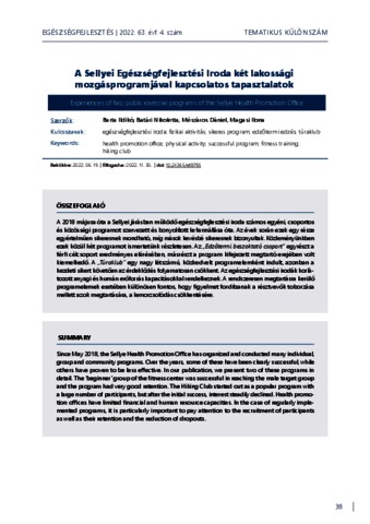 A 2018 májusa óta a Sellyei járásban működő egészségfejlesztési iroda számos egyéni, csoportos és közösségi programot szervezett és bonyolított le fennállása óta. Az évek során ezek egy része egyértelműen sikeresnek mondható, míg mások kevésbé sikeresnek bizonyultak. Közleményünkben ezek közül két programot ismertetünk részletesen. Az „Edzőtermi beszoktató csoport” egyrészt a férfi célcsoport eredményes elérésében, másrészt a program kifejezett megtartó erejében volt kiemelkedő. A „Túraklub” egy nagy létszámú, közkedvelt programelemként indult, azonban a kezdeti sikert követően az érdeklődés folyamatosan csökkent. Az egészségfejlesztési irodák korlátozott anyagi és humán erőforrás kapacitásokkal rendelkeznek. A rendszeresen megtartásra kerülő programelemek esetében különösen fontos, hogy figyelmet fordítsanak a résztvevők toborzása mellett azok megtartására, a lemorzsolódás csökkentésére. | Since May 2018, the Sellye Health Promotion Office has organized and conducted many individual, group and community programs. Over the years, some of these have been clearly successful, while others have proven to be less effective. In our publication, we present two of these programs in detail. The ‘beginner’ group of the fitness center was successful in reaching the male target group and the program had very good retention. The Hiking Club started out as a popular program with a large number of participants, but after the initial success, interest steadily declined. Health promotion offices have limited financial and human resource capacities. In the case of regularly implemented programs, it is particularly important to pay attention to the recruitment of participants as well as their retention and the reduction of dropouts.