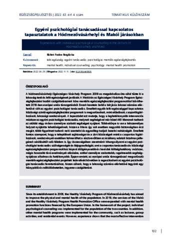 Bálint-Fodor, Boglárka (2022) Egyéni pszichológiai tanácsadással kapcsolatos tapasztalatok a Hódmezővásárhelyi és Makói járásokban = Experiences with individual psychological counselling in the districts of Hódmezővásárhely and Makó. EGÉSZSÉGFEJLESZTÉS, 63 (4). pp. 102-108. ISSN 1786-2434 (nyomtatott); 2498-6666 (elektronikus)