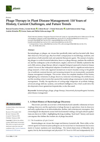 Pertics, Botond Zsombor and Király, Lóránt and Bozsó, Zoltán and Krüzselyi, Dániel and Kolozsváriné Nagy, Judit and Künstler, András and Samu, Ferenc and Schwarczinger, Ildikó (2026) Phage Therapy in Plant Disease Management: 110 Years of History, Current Challenges, and Future Trends. PLANTS-BASEL, 15 (3). No. 368. ISSN 2223-7747