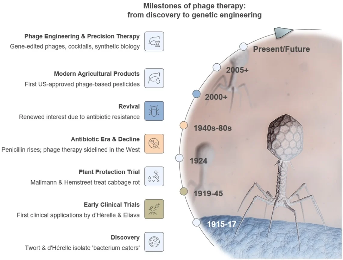 Bacteriophages, or phages, are viruses that specifically infect and lyse bacterial cells. Since their discovery 110 years ago, they have held a unique place in microbiology, medicine, and agriculture as both scientific tools and potential therapeutic agents. The concept of employing phages to combat bacterial infections, known as phage therapy, predates the antibiotic era and has undergone cycles of enthusiasm, neglect, and revival. Initially explored in the early 20th century, phage therapy offered a targeted biological approach to bacterial disease control. However, the widespread adoption of antibiotics led to a significant reduction in phage research, which only regained momentum in recent decades owing to the global rise of antibiotic-resistant bacteria and increasing demand for environmentally sustainable disease management strategies. This review traces the complete timeline of this history, highlighting key milestones in phage discovery, molecular microbiology, the antibiotic era, and the resulting critical events that spurred the modern phage renaissance in plant disease management. Finally, the significance of cutting-edge integration of synthetic biology, advanced phage delivery systems, and artificial intelligence (AI), which could drive the development of next-generation biopesticides, is also discussed.