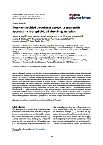 Rizg, Waleed Y. and Albadn, Yonss Mbrook and Khalil, H. P. S. Abdul and Alghamdi, Majed A. and Madkhali, Osama A. and Baradwan, Mohammed and Shazly, Fayroz Medhat and Marwan, Marwan and Yahya, Esam Bashir (2025) Beeswax-modified biopolymer aerogel: A sustainable approach to hydrophobic oil absorbing materials. EXPRESS POLYMER LETTERS, 19 (5). pp. 544-553. ISSN 1788-618X