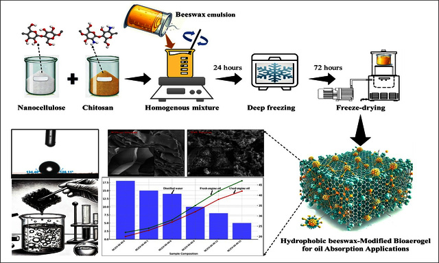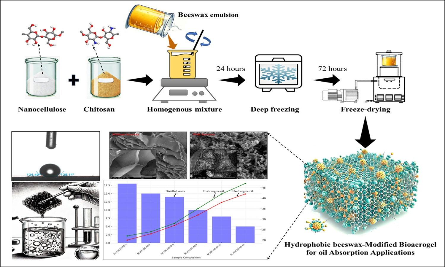 This study presents for the first time a sustainable approach to hydrophobic modification of nanocellulose/chitosan bioaerogels using beeswax emulsion. The incorporation of beeswax into the aerogel matrix resulted in increasing the density from 35.1 to 298 mg/cm3, while the porosity decreased from 96.4 to 62%. Fourier transform infrared spectroscopy (FT-IR) analysis confirmed the successful integration of beeswax into the nanocellulose/chitosan matrix, with distinct peaks corresponding to the characteristic functional groups of beeswax, such as C–H stretching vibrations, further validating the hydro - phobic modification. The mechanical properties showed increased hardness, from 0.24 to 0.95 N/mm2, indicating that higher beeswax content enhanced the rigidity of the aerogels. Contact angle measurements confirmed a dramatic improvement in hydrophobicity, with angles increasing from 47.68 to 134.40 and 128.11° for NC/CH 60-40-15. Water absorption capacity decreased from 17.5 g/g in the control sample to 8 g/g at the highest beeswax concentration, while oil absorption increased significantly, with fresh engine oil absorption rising from 3 to 45 g/g and used engine oil absorption from 2.5 to 40 g/g respectively. These results confirm the successful green modification of bioaerogels using beeswax, providing a sustainable and eco-friendly approach that enhances hydrophobicity, mechanical strength, and selective absorption properties.
