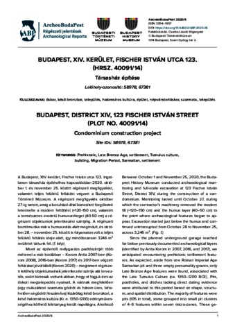 Kraus, Dávid (2020) Budapest, XIV. kerület, Fischer István utca 123. (hrsz. 40091/14) : Társasház építése = Budapest, District XIV, 123 Fischer István Street (plot no. 40091/14) : Condominium construction project. ARCHEOBUDAPEST (6). ISSN 3094-1857