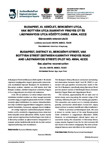 Kurunczi, Mónika (2020) Budapest, XI. kerület, Bercsényi utca, Vak Bottyán utca (Karinthy Frigyes út és Lágymányosi utca között) (hrsz. 4994, 4223) : Gázvezeték-rekonstrukció = Budapest, District XI, Bercsényi Street, Vak Bottyán Street (between Karinthy Frigyes Road and Lágymányosi Street) (plot no. 4994, 4223) : Gas pipeline reconstruction. ARCHEOBUDAPEST (24). ISSN 3094-1857