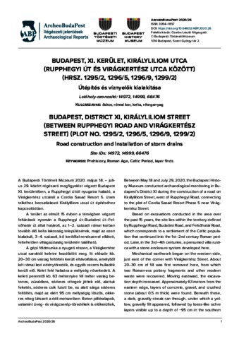 Kurunczi, Mónika (2020) Budapest, XI. kerület, Királyliliom utca (Rupphegyi út és Virágkertész utca között) (hrsz. 1295/2, 1296/5, 1296/9, 1299/2) : Útépítés és víznyelők kialakítása = Budapest, District XI, Királyliliom Street (between Rupphegyi Road and Virágkertész Street) (plot no. 1295/2, 1296/5, 1296/9, 1299/2) : Road construction and installation of storm drains. ARCHEOBUDAPEST (26). ISSN 3094-1857