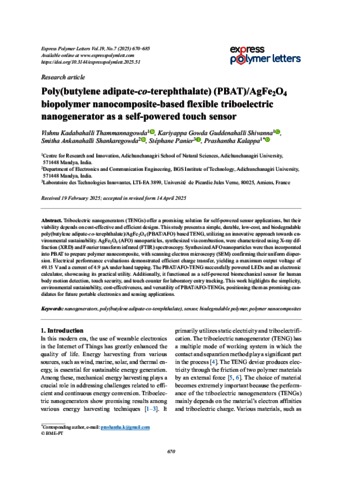 Thammannagowda, Vishnu Kadabahalli and Shivanna, Kariyappa Gowda Guddenahalli and Shankaregowda, Smitha Ankanahalli and Panier, Stephane and Kalappa, Prashantha (2025) Poly(butylene adipate-co-terephthalate) (PBAT)/AgFe2O4 biopolymer nanocomposite-based flexible triboelectric nanogenerator as a self-powered touch sensor. EXPRESS POLYMER LETTERS, 19 (7). pp. 670-685. ISSN 1788-618X