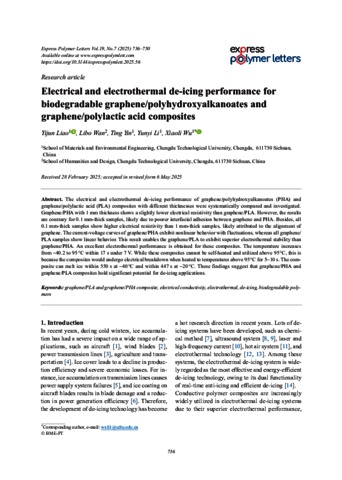 Liao, Yijun and Wan, Libo and Yin, Ting and Li, Yunyi and Wu, Xiaoli (2025) Electrical and electrothermal de-icing performance for biodegradable graphene/polyhydroxyalkanoates and graphene/polylactic acid composites. EXPRESS POLYMER LETTERS, 19 (7). pp. 736-750. ISSN 1788-618X