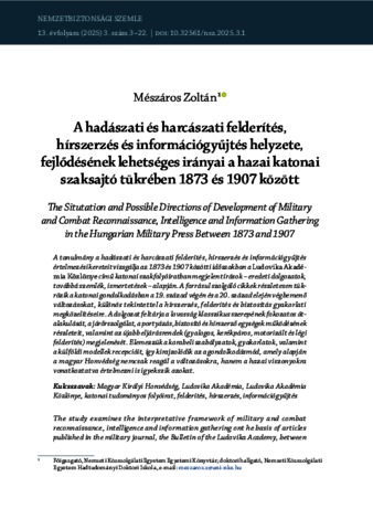 A tanulmány a hadászati és harcászati felderítés, hírszerzés és információgyűjtés értelmezési kereteit vizsgálja az 1873 és 1907 közötti időszakban a Ludovika Akadémia Közlönye című katonai szakfolyóiratban megjelent írások – eredeti dolgozatok, továbbá szemlék, ismertetések – alapján. A forrásul szolgáló cikkek részletesen tükrözik a katonai gondolkodásban a 19. század végén és a 20. század elején végbemenő változásokat, különös tekintettel a hírszerzés, felderítés és biztosítás gyakorlati megközelítéseire. A dolgozat feltárja a lovasság klasszikus szerepének fokozatos átalakulását, a járőrszolgálat, a portyázás, biztosító és hírszerző egységek működésének részleteit, valamint az újabb eljárásrendek (gyalogos, kerékpáros, motorizált és légi felderítés) megjelenését. Elemezzük a korabeli szabályzatok, gyakorlatok, valamint a külföldi modellek recepcióit, így kirajzolódik az a gondolkodásmód, amely alapján a magyar Honvédség nemcsak reagál a változásokra, hanem a hazai viszonyokra vonatkoztatva értelmezni is igyekszik azokat. | The study examines the interpretative framework of military and combat reconnaissance, intelligence and information gathering ont he basis of articles published in the military journal, the Bulletin of the Ludovika Academy, between 1873 and 1907 – original papers, as well as reviews and reviews. The source articles reflect in detail the changes in military thinking in the late 19th and early 20th centuries, with a particular focus on practical approaches to intelligence, defence and security. The essay explores the gradual transformation of the classical role of the cavalry, the details of patrols, raiding, provisioning and intelligence units, and the emergence of newer procedures (on foot, on bicycle, motorised and aerial reconnaissance). The analysis of contemporary regulations and practices, as well as the reception of foreign models, reveals a way of thinking in which the Hungarian Defence Forces not only reacted to changes, but also tried to interpret in relation to domestic conditions.