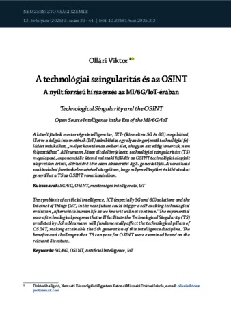 A közeli jövőnk mesterségesintelligencia-, IKT- (kiemelten 5G és 6G) megoldásai, illetve a dolgok internetének (IoT) szimbiózisa egy olyan öngerjesztő technológiai fejlődést indukálhat, „melyet követően az emberi élet, ahogyan azt eddig ismertük, nem folytatódhat”. A Neumann János által előre jelzett, technológiai szingularitást (TS) megalapozó, exponenciális ütemű műszaki fejlődés az OSINT technológiai alapjait alapvetően érinti, elérhetővé téve ezen hírszerzési ág 5. generációját. A vonatkozó szakirodalmi források elemzésével vizsgáltam, hogy milyen előnyöket és kihívásokat generálhat a TS az OSINT vonatkozásában. | The symbiosis of artificial intelligence, ICT (especially 5G and 6G) solutions and the Internet of Things (IoT) in the near future could trigger a self-exciting technological evolution „after which human life as we know it will not continue.” The exponential pace of technological progress that will facilitate the Technological Singularity (TS) predicted by John Neumann will fundamentally affect the technological pillars of OSINT, making attainable the 5th generation of this intelligence discipline. The benefits and challenges that TS can pose for OSINT were examined based on the relevant literature.