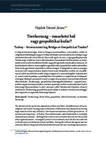 A világ kettéosztottsága, Kelet és Nyugat szembenállása, a társadalmi, vallási és világnézeti különbségek az egyes civilizációk között az évezredek során mindig is nagy történelemformáló erővel bírtak. Ezen erők egyik, ha nem a legnagyobb gócpontja Törökország. A több ezer éves múltra büszkén visszatekintő török birodalom az évszázadok során területén időnként kisebb-nagyobb regionális hatalmakkal osztozva, de kontinuitását tekintve összességében egyedül uralta a geopolitikai szakirodalmakban Kelet és Nyugat közötti átjáróként említett térséget. A hidegháború alatt az országot nemcsak a két szuperhatalom közötti határvonal őrzőjeként említik, de a konfliktust kívülről szemlélő harmadik világ országaival is szomszédságban helyezkedett el, ennek eredményeképp a posztbipoláris korszakban is meghatározó és központi stratégiai földrajzi szerepnek örvend a magát afroeurázsiai centrumként definiáló államalakulat. Törökország – geopolitikai adottságaiból fakadóan – napjaink nemzetközi migrációs folyamataiban való kulcspozíciója mellett az aktuális közel-keleti biztonsági folyamatokban is aktív szerepet vállal. Mindennek fényében célszerű áttekinteni Törökország geopolitikai potenciálját és Ankara növekvő jelentőséggel bíró migrációs és regionális biztonsági lépéseit. | The division of the world, the opposition of East and West, the differencies of social, religious and world-viewing aspects between civilisations had always been having huge impacts on the way of history. One important epicenter of those great forces – if not the most important – is Turkey. The turkish empire, which looks back to a multiple thousand year old past – although from time to time it had to share its territory with other regional powers – managed to preserve its continuity and rule the area referred in the literature as the between East and West. During the cold war the region was not only described as the guard of the borderline between the two rivalising superpowers but as the neighbor of the third world who had been watching the conflict outwardly, therefore Turkey in the postbipolar era also earned a determinate central strategicgeographical role, describing itself as the center of Afro-Eurasia. Turkey, thanks to its geopolitical attributes - beside its key role in the international migration -, plays an active role in the actual middle-eastern security processes. In light of the above-mentioned it became expedient to review Turkey’s geopolitical potential and Ankara’s steps of growing importance in the field of international migration and regional security.