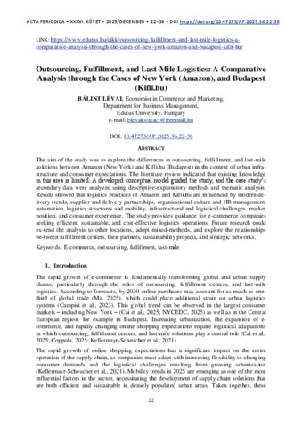Lévai, Bálint (2025) Outsourcing, Fulfillment, and Last-Mile Logistics: A Comparative Analysis through the Cases of New York (Amazon), and Budapest (Kifli.hu). ACTA PERIODICA (EDUTUS), 36. pp. 22-38. ISSN 2063-501X