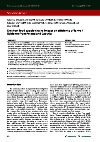 Short food supply chains (SFSCs) are a model promoted among farmers in many countries. This model is popularised as an opportunity to increase the economic efficiency. However, the research results found in the literature are ambiguous. This study therefore aims to assess the impact of participation in short food supply chains on the productivity and efficiency of farms. Poland and the Czech Republic are taken as examples of countries with a contrasting agrarian structure and different size classes of farms are investigated. Primary data come from semi-structured face-to-face interviews conducted among 375 producers divided into two groups – participating and not participating in SFSCs. The indices of productivity and non-parametric data envelopment analysis (DEA) were applied to assess differences in efficiency for two groups mentioned above. It was demonstrated that in Poland small farms participating in SFSC achieve higher production efficiency than farms not participating in SFSC.