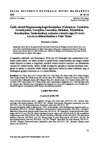 Ködöböcz, Viktor (2025) Újabb adatok Magyarország bogárfaunájához (Coleoptera: Carabidae, Cerambycidae, Cucujidae, Lucanidae, Meloidae, Rhysodidae, Scarabaeidae, Tenebrionidae), valamint a bánáti csiga (Drobatia banatica) előfordulásához a Felső-Tiszán. FOLIA HISTORICO NATURALIA MUSEI MATRAENSIS, 49. pp. 45-72. ISSN 0134-1243