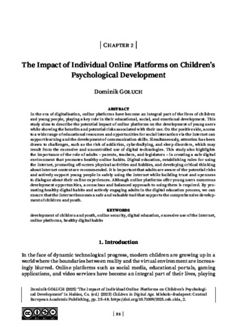 Dominik, Gołuch (2025) The Impact of Individual Online Platforms on Children’s Psychological Development. In: Children in digital age. Central European Academic Publishing, Miskolc, Budapest, pp. 25-48. ISBN 9786157027114
