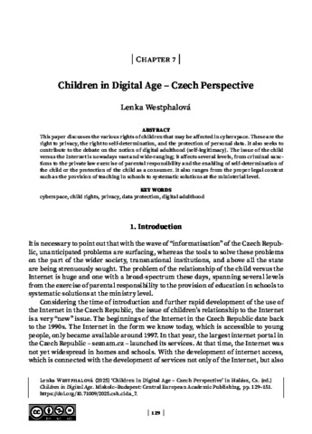 Westphalová, Lenka (2025) Children in Digital Age – Czech Perspective. In: Children in digital age. Central European Academic Publishing, Miskolc, Budapest, pp. 129-151. ISBN 9786157027114