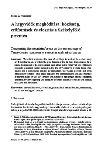 Szabó, Árpád Töhötöm (2025) A hegyvidék meghódítása: közösség, erőforrások és elosztás a Székelyföld peremén. REGIO: KISEBBSÉG KULTÚRA POLITIKA TÁRSADALOM, 33. (1). 39.-65.. ISSN 0865-557X