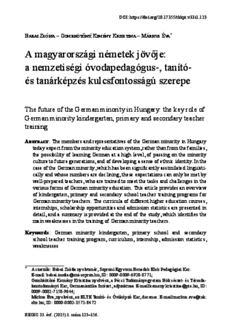 Babai, Zsófia and Gombkötőné Kemény, Krisztina and Márkus, Éva (2025) A magyarországi németek jövője: a nemzetiségi óvodapedagógus-, tanító- és tanárképzés kulcsfontosságú szerepe. REGIO: KISEBBSÉG KULTÚRA POLITIKA TÁRSADALOM, 33 (1). pp. 123-156. ISSN 0865-557X